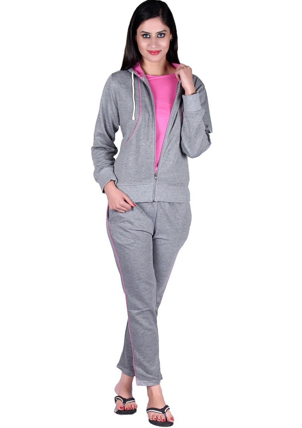 Stay comfortable and chic with this women’s grey tracksuit featuring vibrant pink piping details. The full-zip hooded jacket and matching track pants offer a relaxed yet stylish fit, perfect for lounging, errands, or light exercise.